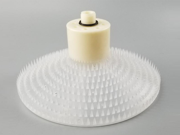 旋混曝气器是采用多层螺旋切割的形式进行充氧曝气的装置,当气流进入曝气器时,气流首先通过二道螺旋切割系统后进入下层多层锯齿形曝气头,进行多层切割,使气泡切割成微气泡,这样大大提高了氧的利用率,具有曝气均匀,充氧效率高的特点。